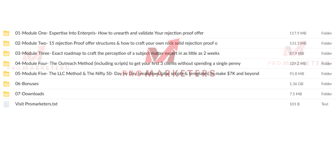 - The course covers five modules, including offer validation, 15 proven offer structures, expert positioning, and sales systems like the LLC Method and Nifty 50.